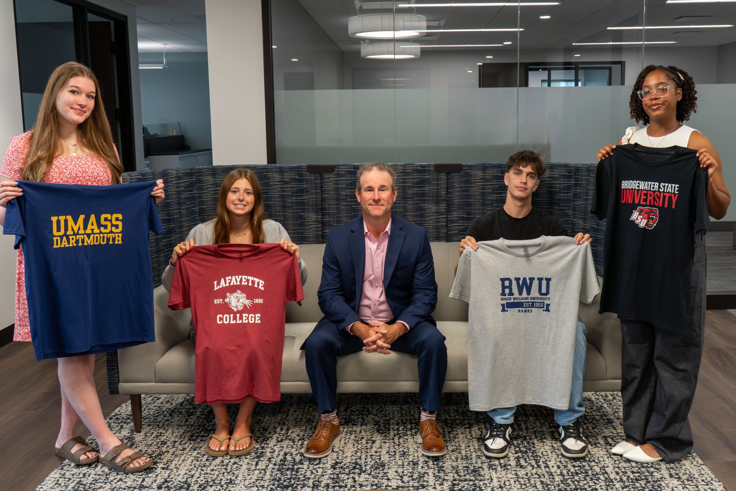 From left to right: Hannah Abrams of Westport High School attending UMass Dartmouth, Addison MacDonald of Mansfield Highschool attending Lafayette College, Joseph T. Baptista Jr., President & CEO of Mechanics Cooperative Bank, Christian Cordeiro of Greater New Bedford Regional-Vocational-Technical Highschool attending Roger Williams University, and Fabiana Gomes of Bristol Plymouth Regional-Technical High School attending Bridgewater State University.